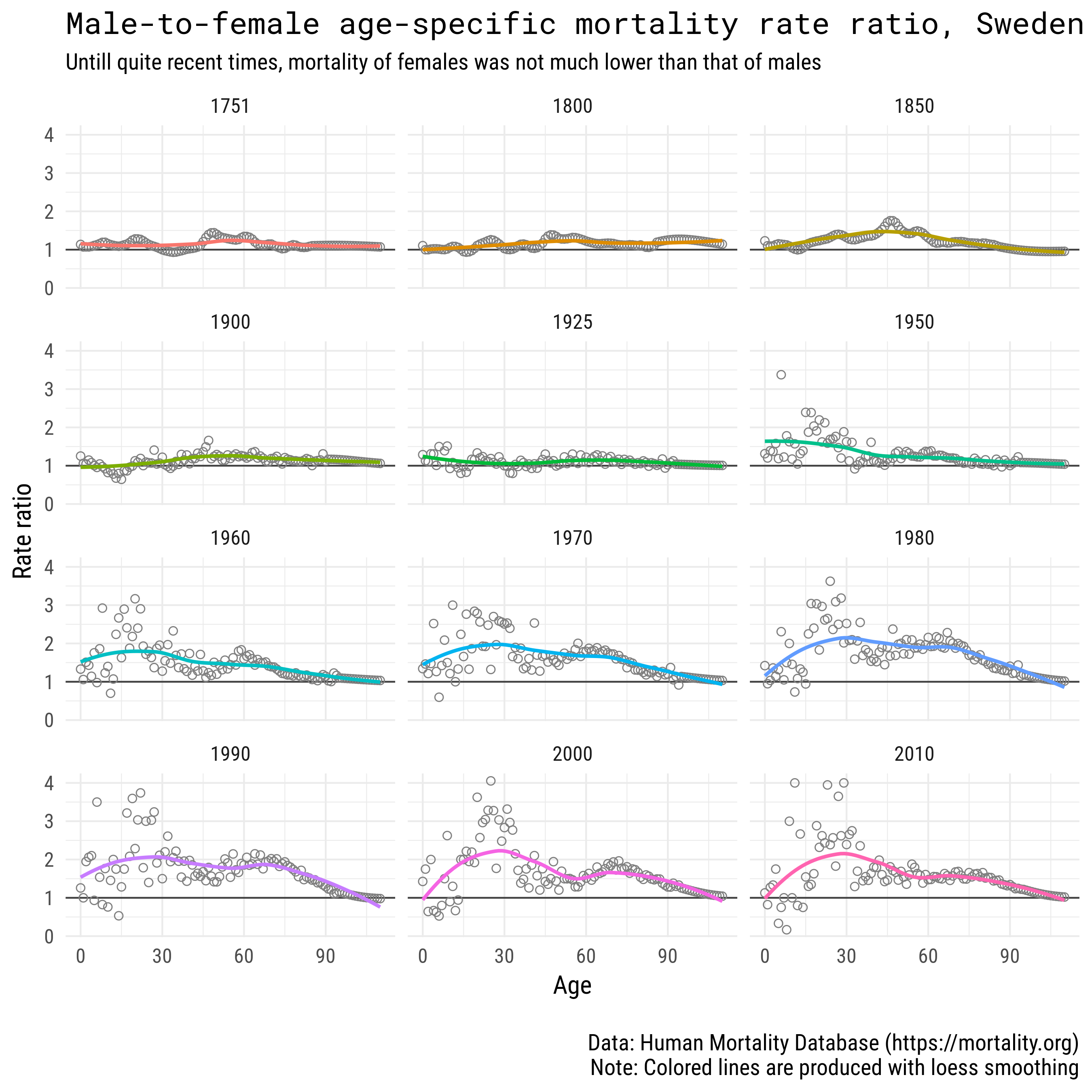 labs(title = "Male-to-female age-specific mortality rate ratio, Sweden",